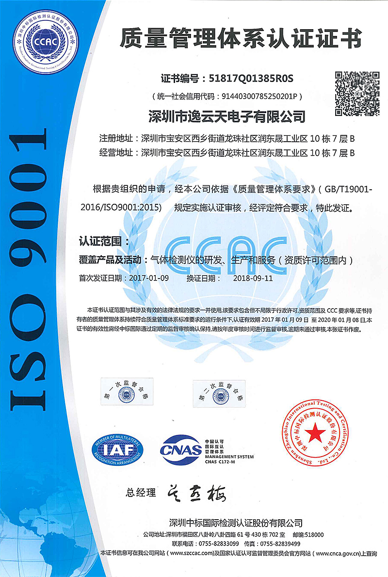 深圳市逸云天電子有限公司成立于2006年初,是集設(shè)計、研發(fā)、生產(chǎn)、銷售于一體的國家高新技術(shù)企業(yè)??商峁┯卸居泻Α⒁兹家妆瑲怏w檢測報警儀、氣體分析儀、氣體在線監(jiān)測預(yù)處理系統(tǒng)、VOCs在線監(jiān)測系統(tǒng)、微型空氣監(jiān)測站、惡臭在線監(jiān)測系統(tǒng)、差分紫外光譜氣體分析儀、激光氣體分析儀、環(huán)保安監(jiān)氣體監(jiān)測云平臺等產(chǎn)品。逸云天已通過ISO9001質(zhì)量管理體系認(rèn)證、IS014001環(huán)境管理體系認(rèn)證、ISO45001職業(yè)健康安全管理體系認(rèn)證、CCEP中國環(huán)保產(chǎn)品認(rèn)證;并取得相應(yīng)產(chǎn)品防爆合格證、CPA型式批準(zhǔn)證書、消防產(chǎn)品認(rèn)證證書、外觀專利證書、軟件著作權(quán)登記證書等。本公司產(chǎn)品已經(jīng)在石油、化工、燃?xì)廨斉?、倉儲、市政燃?xì)?、消防、環(huán)保、冶金、生化醫(yī)藥、能源電力等行業(yè)得到了廣泛的應(yīng)用,并得到廣大客戶的一致認(rèn)可。